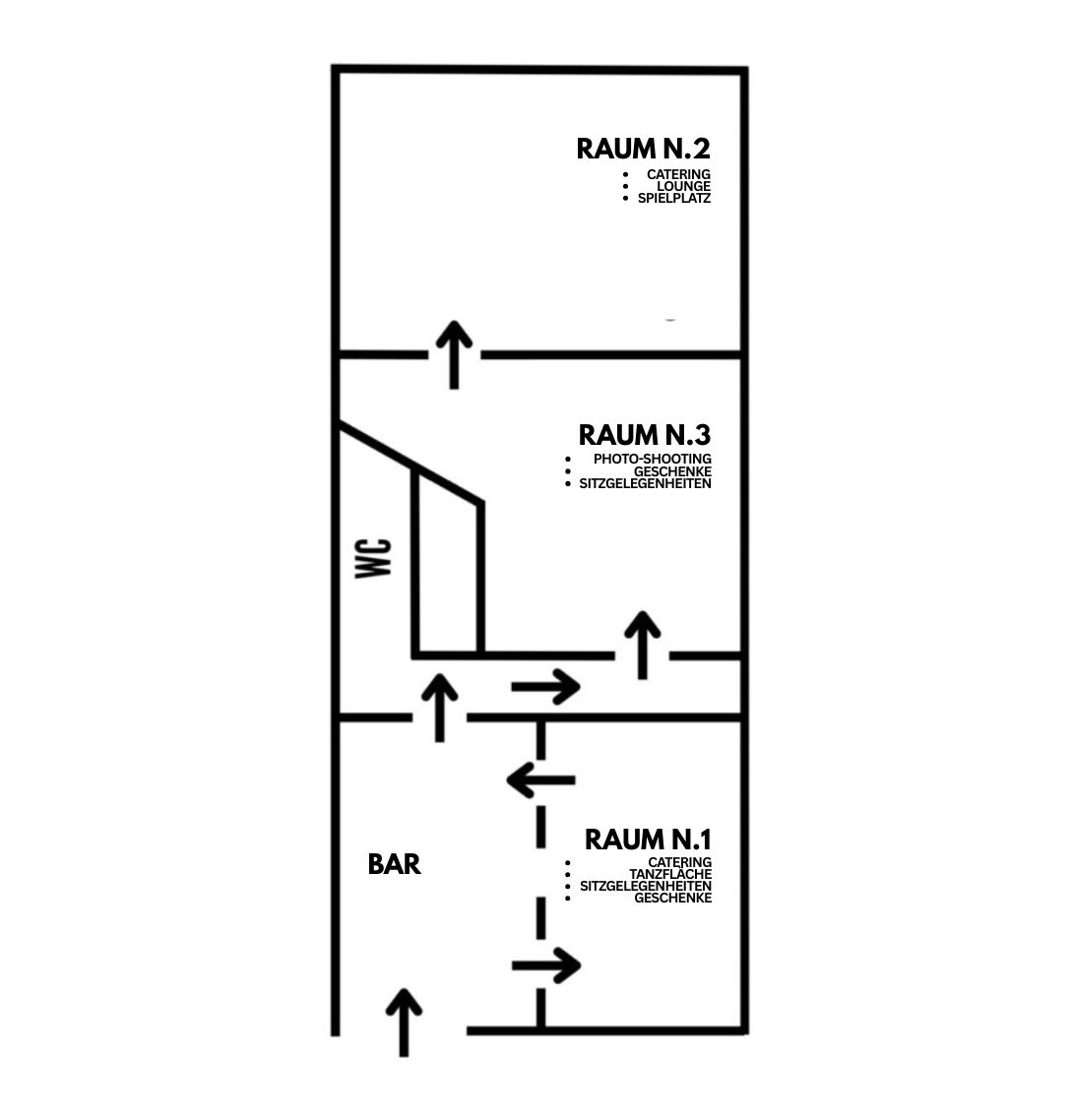 - Raum 2: Platz für 40-50 stehende oder 30-40 sitzende Gäste.